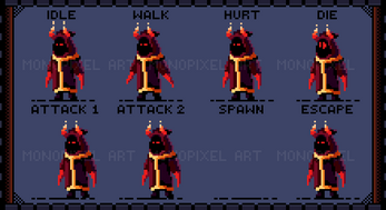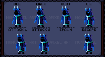 - Evil Creature (Idle, Walk, Hurt, Die, Attack1, Attack2, Spawn-Teleport, Espace-Teleport)