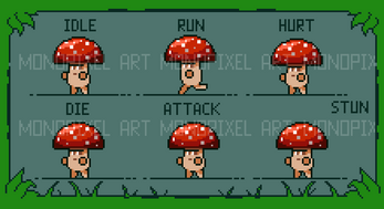 - Mushroom with a set of animations (Idle, Hurt, Die, Run, Attack, Attack with Stun, Stun).