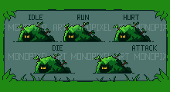- Bush Monster (Idle, Hurt, Die, Run, Attack, AttackTimeFrame)